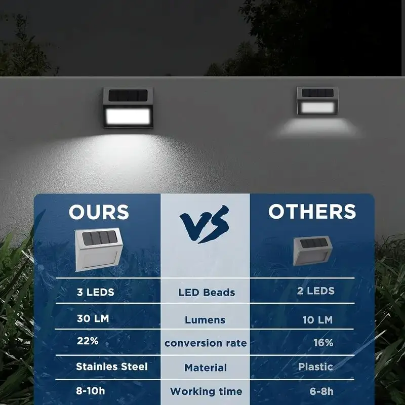 Efficient and durable: The solar deck light panel is made of high-quality monocrystalline silicon with a conversion rate of up to 18%. It is equipped with a large capacity battery that can store enough electricity until dawn. Three LED light beads will not be too dim or too bright; the light will not be too dazzling and will not disturb your neighbour's. It is very suitable for deck railings, steps, stairwells, yards, and gardens, making your house brighter and safer, without worrying about strangers approaching your house. Free your hands and reduce the burden of life. Equipped with a built-in light sensor that can automatically switch on and off, it charges automatically during the day (4-6 hours) and works automatically at dusk (6-8 hours) without the need to switch on and off every day. Wireless design is not only more convenient but also reduces security risks. Our solar outdoor lights are charged through solar energy, which not only eliminates the need for high electricity bills, but also saves energy and protects the environment.