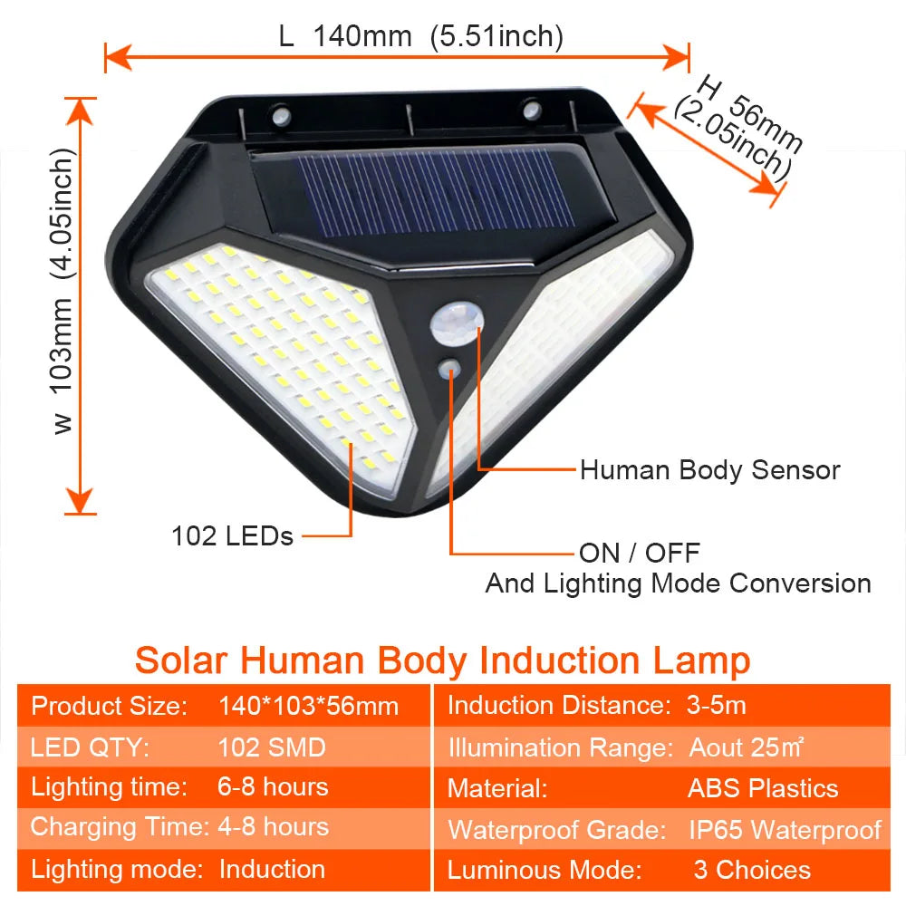 2side 102LED PIR Motion Sensor Solar Energy Street lamp 3 lighting modes Yard Path Home Garden Solar Power Induction Wall Light