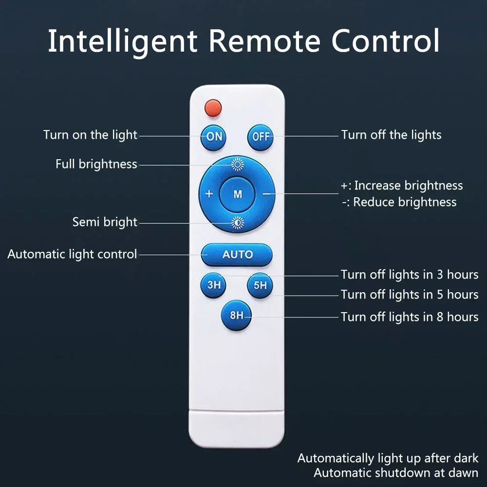 Remote control switch: 10 meters remote control, remote control can be timed (3/5/8 hours timer), adjustable brightness (full brightness - half brightness, "+" increase brightness, "-" reduce brightness)