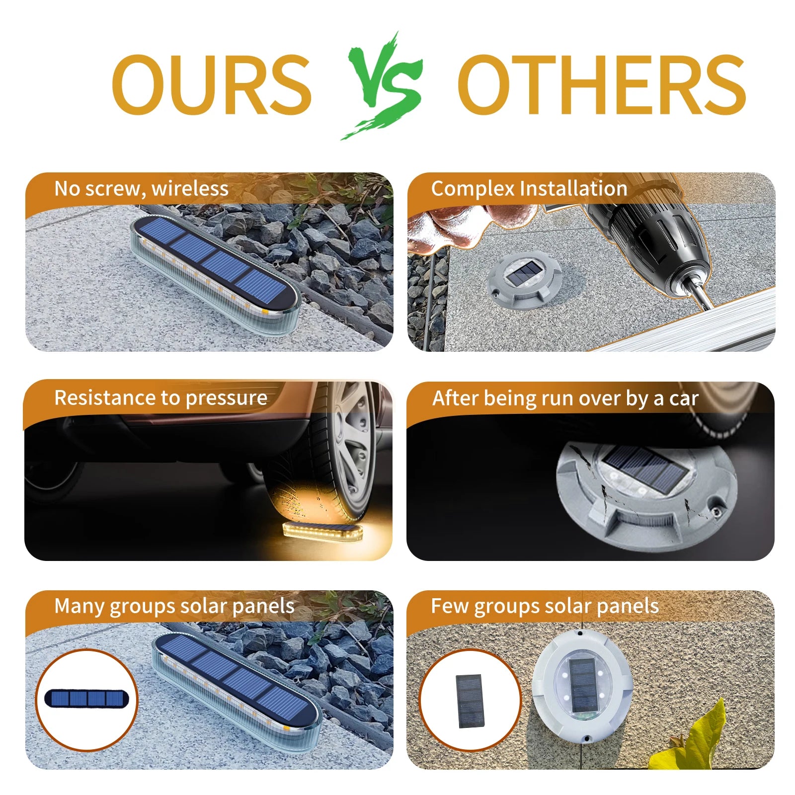 Waterproof & Durable. Solar powered lights outdoor is made of high-strength PC material and IP68 waterproof design, can withstand all kinds of bad weather throughout the season.