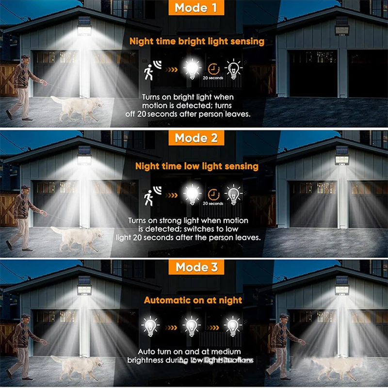 2. Detection Mode (high brightness when someone comes, the lamp turns off after 20-25 seconds when someone leaves) 3. Medium Light Constant Brightness (50% brightness)
