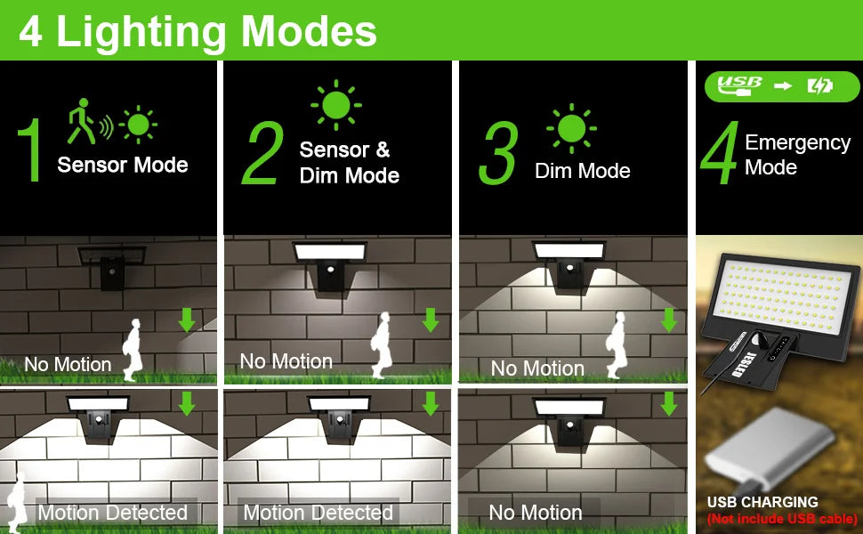 PIR Motion Sensor&Four Lighting Modes. The led outdoor light intelligent sensor control, motion sensor outdoor light can detect up to 30 ft. 120-degree wide angle lighting, installed at a height of 8 ft - 12 ft, lighting diameter range up to 30 ft, providing more visible area. The solar outdoor lights motion sensor is designed with four lighting modes: ① strong light induction mode; ② dim light long bright, strong light induction mode; ③ strong light long bright mode; ④ dim light long bright mode.