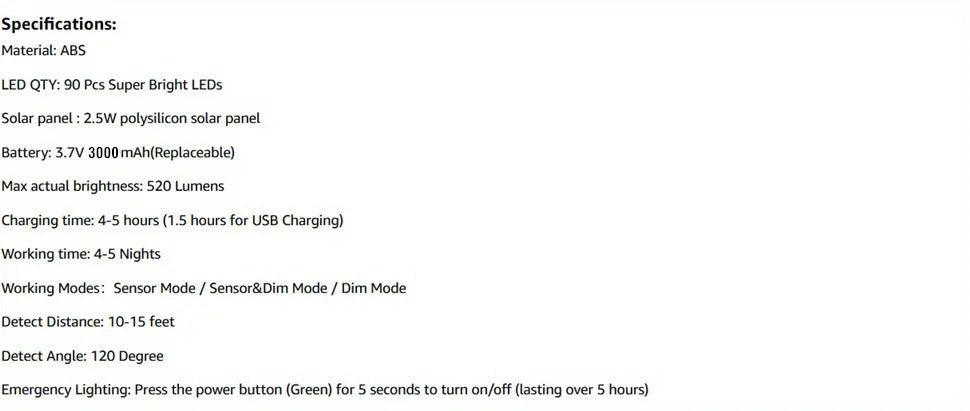High Brightness SMD2835 Lamp Beads. The solar outdoor led light is equipped with 90 SMD2835 LED beads.90 Super Bright LEDs designed to provide ultra-high brightness illumination for a wide area. These beads have high luminous efficiency, good monochromaticity, green and lead-free. Each bead with unique heat sink has good heat dissipation capability, Brighter solar motion lights to provide lighting and security to your farmhouse, garage, pathway and more.